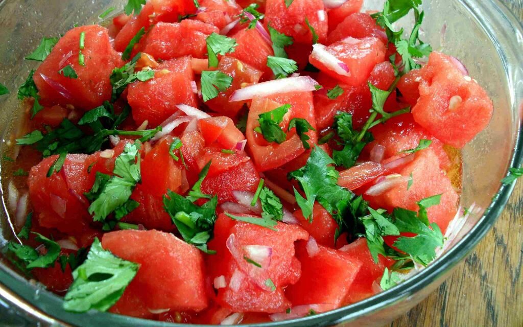 Готовим: Кружочками нарезать все промытые крупные помидоры, колечками нашинковать очищенный салатный лучок, переложить эти ингредиенты в салатник. Далее пластинками нарезать или просто порубить мелко заранее очищенные дольки чеснока, из оставшихся компонентов, указанных в списке, приготовить заправку. В салатник с овощами вылить приготовленную томатную заправку, перемешать все, по желанию приготовленный салат украсить кинзой или какой-то другой огородной свежей зеленью и подавать к столу.