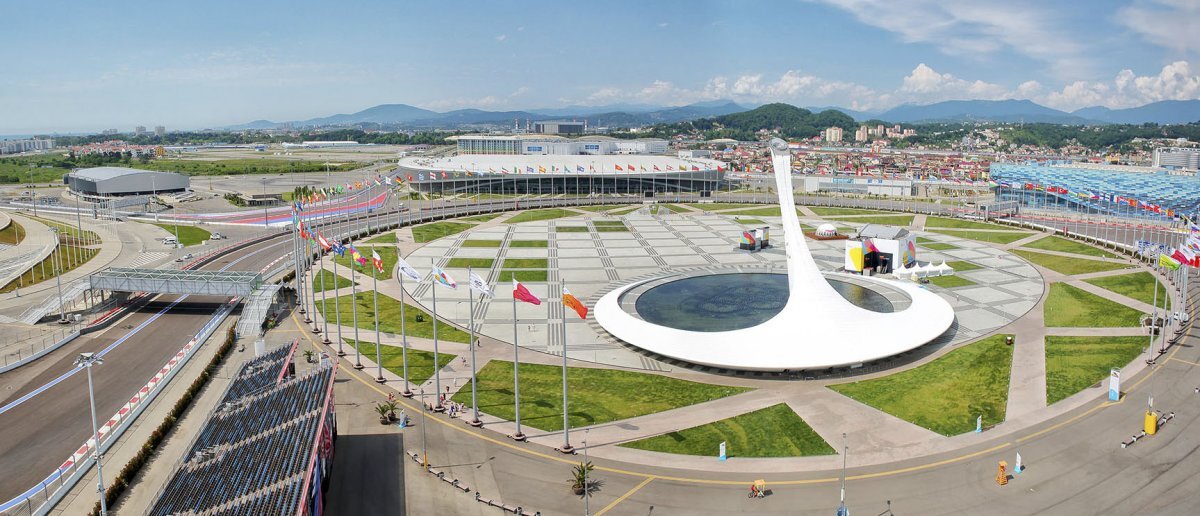 Олимпийский стадион «Фишт», ледовый дворец «Большой», ледовый дворец спорта «Айсберг», малая ледовая арена «Шайба», крытый конькобежный центр «Адлер-Арена», арена для кёрлинга «Ледяной клуб», а также — поющие фонтаны в Сочи в Олимпийском парке.