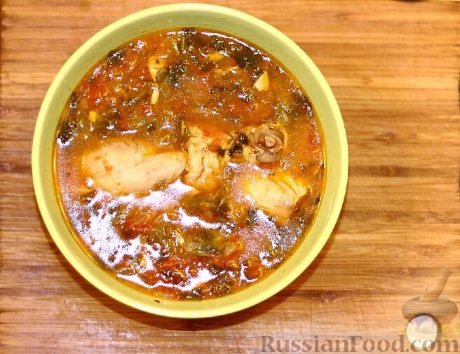 Чахохбили - это простое и очень вкусное блюдо из мяса птицы, тушенного в соусе из томатов и лука. Продукты: Курица - 1,2-1,5 кг; Лук - 1 кг; Помидоры - 1 кг; Чеснок; Петрушка; Кинза; Базилик; Соль; Перец . Вот так выглядят продукты которые нужны . Сначала бирьом курицу и рубим на кусочки.Потом нужно обжарить до корочки ,на сухой сковородке с толстым дном. Если у вас нет сковородки, можно использовать казан.Уже готовую курицу нужно посолить,добавить туда немного масла и положить лук. Потом где-то минут через 5 добавить туда ,уже заранее нарезанные помидоры.О ставить это все на медленном огне под крышкой на полчаса. Минут за 5-10 до готовности чахохбили, засыпаем чеснок, зелень, специи.