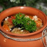 Теперь укладываем в горшочки слоями: печень, кусочки отварного картофеля, баклажаны с томатами и т.д. Слой баклажан посыпаем измельченным чесноком. В каждый горочек наливаем по 2 ст.л. сливок и 1/2 стакана воды или бульона.