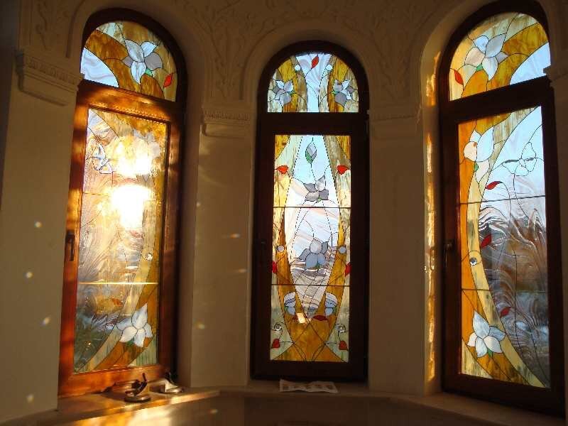 Во-первых, цвет такого витража зависит не от использования разноцветных стекол, а от нанесения фрагментов специальной пленки разных цветов. То есть, пленочный витраж – это, по сути, обычное стекло с нанесенным на нее узором из кусочков цветной прозрачной пленки. Конечно же, нанесение этого изображения – тоже занятие не из простых. Но оно требует намного меньших усилий, да и денег тоже, а также значительно экономит время.