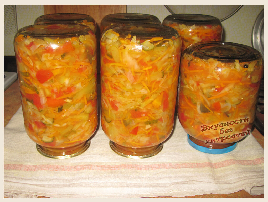 Остренький салатик из овощей, которые, несмотря на термическую обработку, остаются хрустящими. Будет радовать вкусом лета всю зиму, если, конечно, не будет съеден еще осенью. Овощи тщательно моем. У капусты вырезаем кочерыжку, у помидор плодоножку, морковь чистим, у огурчиков срезаем «попки», у перца удаляем плодоножку и середину с семечками.