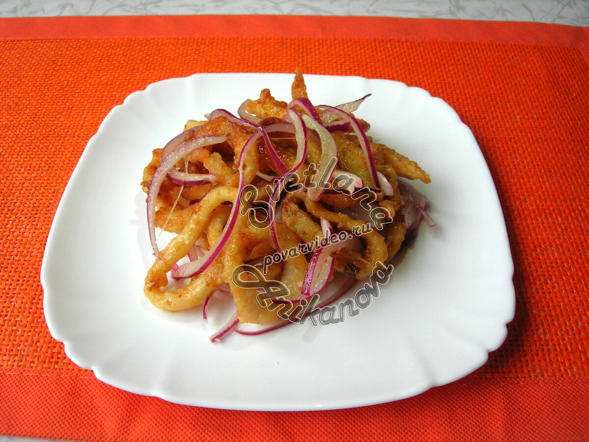 Предлагаю вам праздничный рецепт салата с кальмарами. Честно сказать, даже не помню откуда у меня этот рецепт салата появился, но ему уже очень много лет. Готовлю его нечасто, но т.к. это еще и самый любимый салат моей дочери, то все ее праздники не обходятся без него. При том, что она у меня не любит ни рыбу, ни морепродукты этот салат для нее исключение и все дело в заправке. Заправка для салата может сыграть решающую роль для создания его вкуса и это, как раз, тот самый случай. Все ингредиенты салата пропитавшись вкусом этой заправки, меняют свой естественный вкус и получаются ну очень пикантными, а в совокупности получается просто взрыв вкуса! Я очень рекомендую использовать для этого салата именно красный лук, желательно крымский. Ингредиенты: Кальмары – 250 г Красный лук – 100 г Апельсин – 0,5 шт. Лимон – 1 шт. Мед – 1 ст.л. Горчица готовая – 1 ч.л Растительное масло для жарки – 70 мл Растительное масло для заправки – 2 ст.л. Мука – 0,5 стак. Все подробности и процессы приготовл