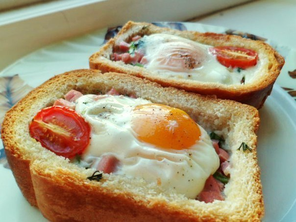 Вбиваем одно яйцо, соли и перчим. Сверху 1/2 кубиков сосиски, 1/2 лука и 1/2 укропа. На всю эту красоту вбиваем ещё одно яйцо. Солим его и перчим. В уголок кладём половинку черри. Краешки хлеба с