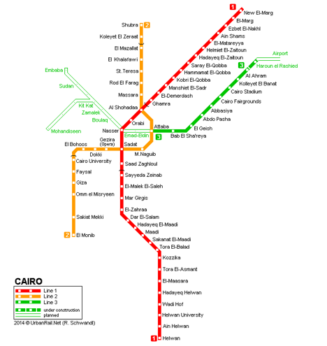Вчера мне пришлось прокатиться на каирском метро. Находясь в аэропорту Каира целый день мне захотелось навестить подругу, которая живет в Гизе, около пирамид. Цена, озвучиваемая таксистом мне показалась слишком высокой. С каирского аэропорта до Гизы нужно ехать через весь город. Поэтому я решила добраться на такси до станции метро, а потом поехать до Гизы посредство метрополитена. Каирское метро - одно из самых удобных на Ближнем Востоке. В Каире вечные пробки и добраться там до куда бы не было довольно тяжело. Это дает шанс доехать до мест назначения без особых проблем. Но если вы решите доехать на метро, вам нужно учесть несколько вещей, чтобы поездка стала проще и удобнее. 1. Каирское метро имеет три линии. Через линию 1 вы можете добраться до центральных точек города, таких как Маади, Тахрир (станция Эль Садат), Рамсис (станция Эль-Шохада) и другие части центра города. Линия 2 начинается с юго-западных точек города и идет в Гизу. Он идет в такие места, как Каирский универс