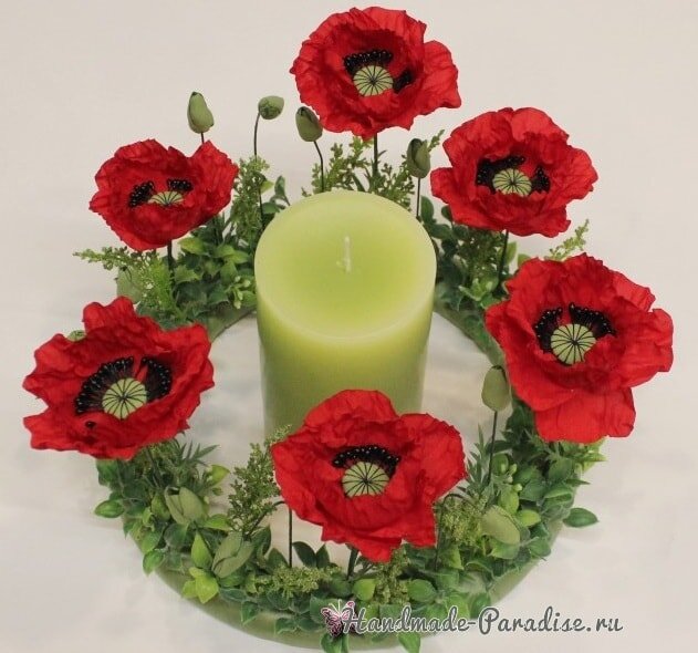 Красные маки из ткани своими руками создать совсем несложно, и пошаговый мастер-класс позволит вам быстро справиться с работой. Из красных маков ручной работы можно создать очень красивый декоративный подсвечник для украшения интерьера. Сморите еще: Мак полевой из капрона Красные МАКИ крючком. Схемы вязания Схема вышивки «Маки в китайской вазе» Для работы нам понадобятся следующие материалы и инструменты: Дополнительно, для создания подсвечника: пенопластовый обруч, атласная лента зеленого цвета, толстая свеча. Читать далее https://handmade-paradise.ru/krasnye-maki-iz-tkani-svoimi-rukami/