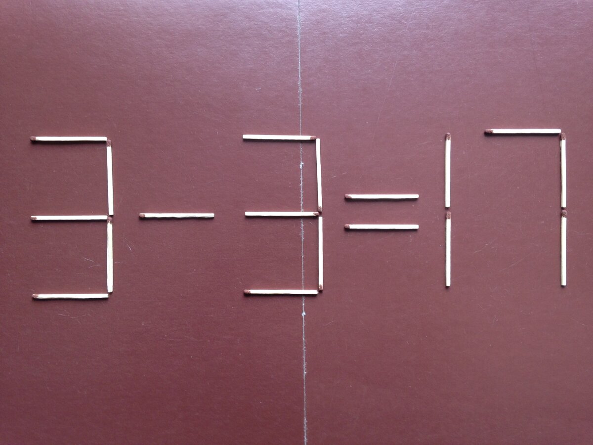 Исправьте неверное равенство 3-3=17 на верное равенство, переложив четыре спички! Задача № 444