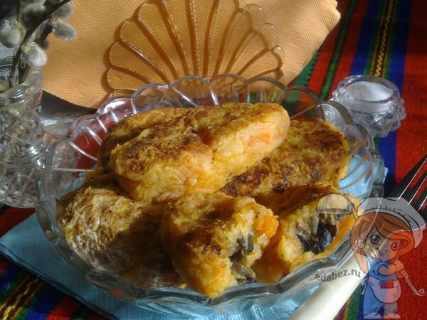 Множество разнообразных вкусных, эффектных и питательных блюд можно создать из картошки и грибов. К примеру, постные нежные зразы. Это один из тех замечательных рецептов, которые помогают превратить оставшееся не съеденным картофельное пюре в настоящее лакомство. Чтобы зразы стали еще вкуснее и интересней, кроме отварного картофеля можно взять еще и вареную морковь или не потребовавшееся в приготовлении гарниров к другим блюдам морковно-картофельное пюре. Для 9 относительно крупных зраз пригодились: Для начинки подойдут любые свежие, сухие или замороженные грибы. Можно, к примеру, смешать в ней свежие шампиньоны разных видов и «устричные грибы» вешенки. Пригодятся и любые лесные грибы, пригодные для жарки. Их можно соединить в начинке с шампиньонами и вешенками или создать начинку только из выращенных грибов. Запах свежих магазинных грибов не отличается особой яркостью. Поэтому, чтобы усилить грибной аромат, для этих зраз были взяты еще и несколько кусочков сухих белых грибов. Если н