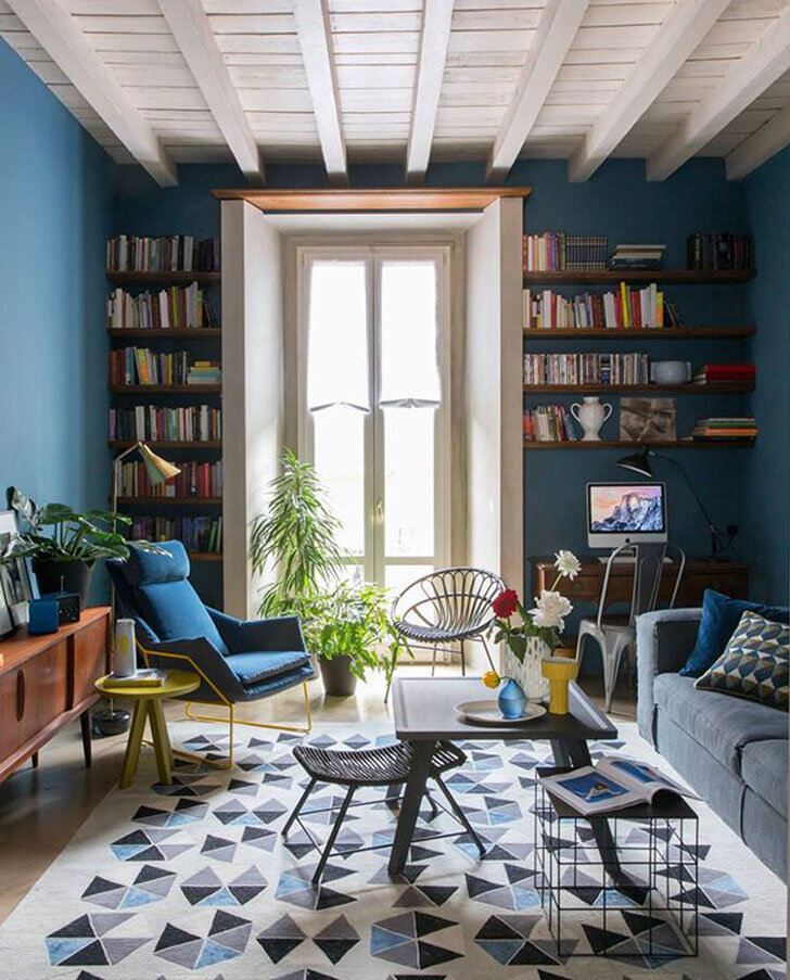 Дизайнеры CASAfacile переделали квартиру с минимальным бюджетом. Большую часть стен и мебели просто перекрасили в более подходящий цвет. Вдохновением для них послужила морская тематика. Стены в гостиной перекрасили в самый тёмный оттенок синего. Часть мебели оставили из прежнего интерьера, как, например, комод середины прошлого века. На диване пришлось перетянуть обивку – она стала темнее и фактурней. Заменили и подушки – новые цвета и ткани выглядят намного дороже и благородней. Массивный журнальный стол с растрескавшейся поверхностью заменили на лёгкий металлический. Во всей квартире сохранили исторические потолки с балками. Их просто обновили, покрасив в белый цвет. Все стены в кухне-столовой покрасили в белый цвет, сосредоточив основной акцент на стене с дизайнерскими обоями. На ней «расцвели» гигантские цветы, в тон которым подобрали обивку кресел. Старый стол удалось сохранить, но его перекрасили в белый цвет. А стулья пришлось заменить – все они разные. Комод тож
