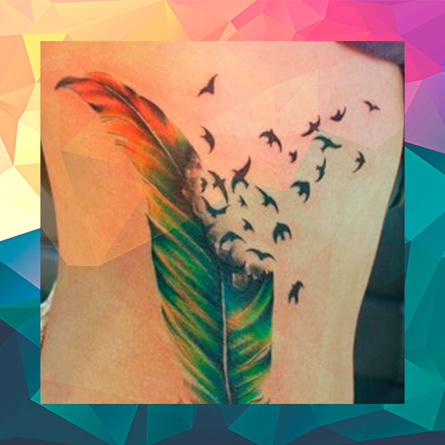 Татуировка на ребрах — это очень больно. Можете проверить на карте татуировок. Но, если все же решитесь наносить этот рисунок, обратите внимание на эскизы в стиле акварель. Смотрится нежно и изящно. Перо и стая птиц. Ступни, распространенное место для тату, среди девушек. И перо отличный символ для такого рисунка. Тату на шее, за волосами. Удобно тем, что легко скрывается. Даже очень хороший эскиз будет лучше смотреться в цвете. Сравните черно-белый вариант. С эскизом в который добавили один цвет. И цветной акварельный эскиз. Кстати, перо круто смотрится и в мужских тату. Смотрите нашу подборку. Чаще всего такой символ изображают небольшим. Но, даже на объемных участках тела перо смотрится эффектно. Тема «перо с птицами», часто повторяется. Но, это не делает эскизы одинаковыми. Выбирая эскиз, значение можно вкладывать в "происхождение" пера. Например, это может быть перо павлина, орла, ворона или даже страуса. Ловец снов — популярная тату с перьями. Кстати, этот символ пришел к нам от
