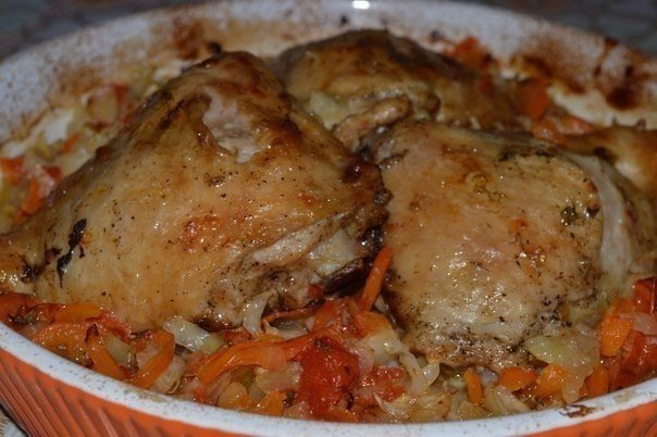 Куриные окорочка посолить, поперчить по вкусу, смазать йогуртом и оставить на 1 час в холодильнике. Капусту мелко нашинковать. Лук нарезать полукольцами. Морковь нарезать кружками. Перец нарезать длинной соломкой. Томат нарезать кружками. В форму для выпечки выложить овощи слоями: лук, морковь, капуста, чеснок, перец, томат. Сверху выложить курицу. Запечь в духовке при 180°C около часа.