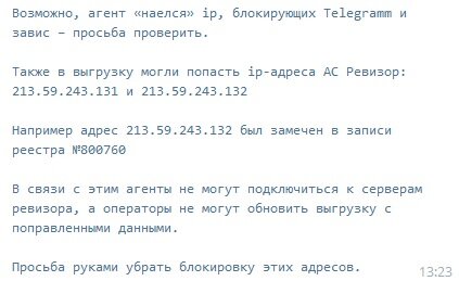 Сегодня утром, 18 апреля, интернет-провайдеры получили письмо от Роскомнадзора с настоятельной просьбой перезагрузить программно-аппаратный комплекс «Ревизор», который используется для мониторинга доступа к сайтам из реестра. «Ревизор» завис из-за огромного количества IP-адресов, которые попали в реестр запрещенных. Также в письме говорилось, о том что операторам необходимо проверить адреса на которые отправляется статистика по заблокированным ресурсам. При проверке выяснилось, что оба адреса заблокированы.
