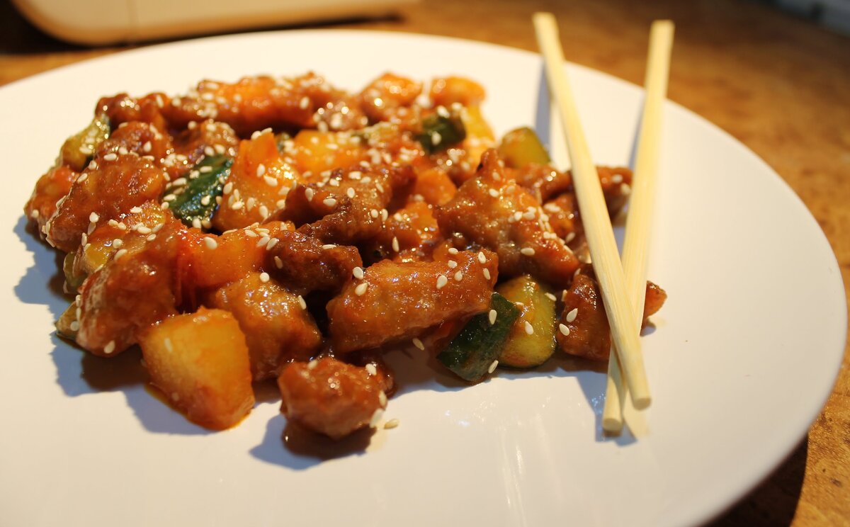 Блюдо китайской кухни. Подписывайтесь, читайте и готовьте с нами. Хорошего всем настроения На 4 порции Время приготовления: 45 мин 600 г свинины 150 мл соевого соуса 1 ст. л. пшеничной муки 1 ст. л. крахмала 1 средняя морковь 1 небольшой зелёный острый перец 150 г ананасов, консервированных в собственном соку 2–3 ст. л. растительного масла 150 мл томатного сока 2–3 ст. л. сахара 2 ст. л. столового уксуса соль по вкусу • Свинину промыть, обсушить, нарезать на брусочки шириной в 1 см. Выложить в миску, залить соевым соусом, добавить муку и крахмал, оставить мариноваться на 5–10 минут. Смесь по консистенции должна походить на густую сметану. • Морковь и перец очистить и нарезать крупной соломкой. Ананасы нарезать на небольшие кусочки. • На сковороде разогреть растительное масло. Обжарить морковь 3–4 минуты, добавить перец, через 2–3 минуты – ананасы. Выложить в отдельную тарелку. • На той же сковороде аккуратно, чтобы не слиплись, обжарить кусочки мяса до появления корочки. • Смешать
