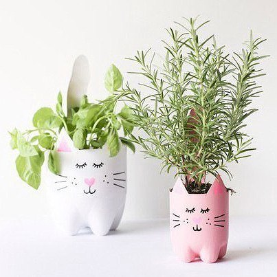 Для создания таких прекрасных горшочков нам понадобятся: земля, ножницы, бутылка, фломастеры Сначала вырезам из бутылок вот такую кошечку. С помощью фломастеров рисуем личико делаем цветную шерсть. Можете дать рисовать кошечку ребенку, ведь это очень просто! Вот и готовы наши замечательные кошечки-горшочки!