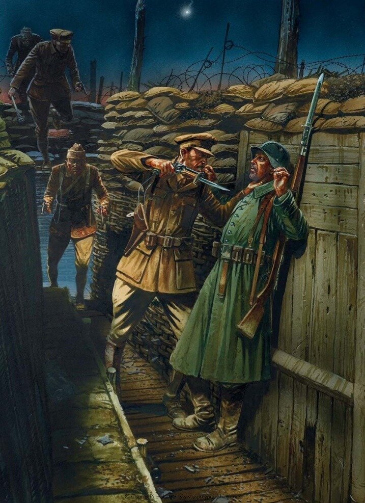 Траншеекопание - тактика, разработанной англичанами, но французы и немцы быстро ее переняли. До самого появления "окопных метел" во время рейдов на вражеские полевые укрепления в ход шли самые разнообразные средства ближнего боя. Наиболее популярными были пистолеты и револьверы, затем - гранаты, ну и разнообразные булавы и ножи В конце 1916 года капитан Артур Притчард ( Arthur Pritchard ), который служил в Королевском Беркширском полку (Royal Berkshire Regiment) во Фландрии с 1915 года, разработал штык для стандартного револьвера британской армии - Webley Mk VI. Идея была простой - дать второй шанс солдату, не успевающему перезарядится во вражеском окопе. Несмотря на то, что Webley перезаряжался быстро (для револьвера) - особенно при помощи специального приспособления, которое нарисовано рядом с кобурой офицера на иллюстрации, считалось, что в трудной ситуации короткий штык может быть чрезвычайно полезен. Штык Pritchard был укороченным вариантом стандартного клинка винтовки Гра,