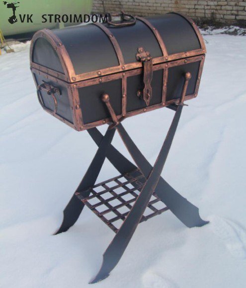 Детские воспоминания о пиратских сражениях навеяли автору идею мангала-сундука с сокровищами, установленного на двух мечах-ятаганах. Кроме обычной жарки шашлыков, такой ящик с крышкой можно использовать как мини-коптильню. Для этого потребуется снабдить конструкцию небольшой вытяжной трубой.