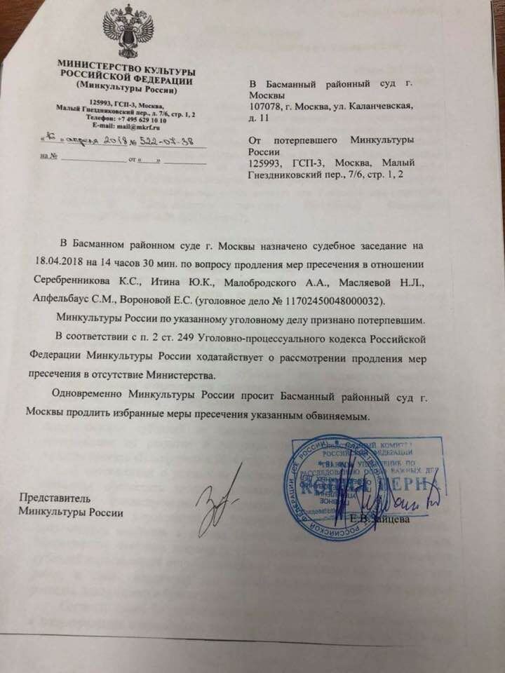 Как министерство культуры России потребовало задержания Серебренникова, Малобродского, Итина и Апфельбаум.