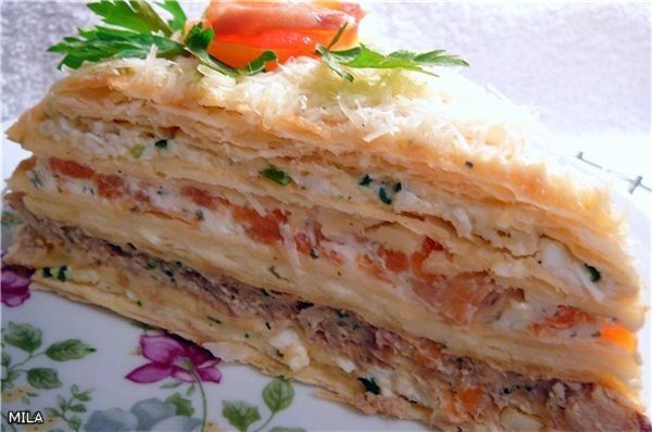 Очень нежный, мягкий и безумно вкусный закусочный торт. Правда есть один недостаток...очень быстро съедается... Коржи беру покупные, а начинки можно ставить разные.