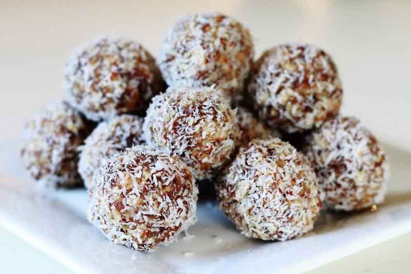 Все ингредиенты, за исключением кокосовой стружки, измельчите блендером. Слепите из массы шарики и обваляйте в оставшейся кокосовой стружке.
