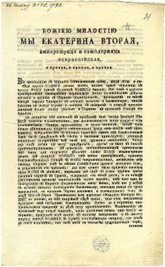…но он остаётся тайной!.. Впрочем, ненадолго – Шагин-Гирей неожиданно отказывается от ханства; в июне Потёмкин принимает присягу крымской знати (все они получат права и льготы российского дворянства) – и пишет императрице: «Границы теперешние обещают покой России, зависть Европе и страх Порте Оттоманской. Взойди на трофей, не обагренный кровию, и прикажи историкам заготовить больше чернил и бумаги!»
