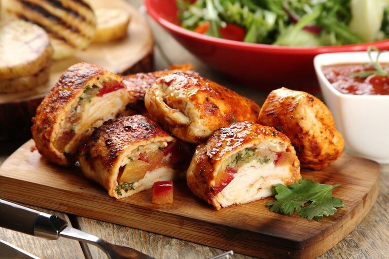 Это блюдо имеет невероятный вкус и аромат, его особенность заключается в использовании консервированных персиков. Время приготовления рулетиков составляет менее одного часа. Список необходимых продуктов: · куриное филе – 400 г (рекомендуется использовать незамороженное, тогда его будет легче отбить); · несколько столовых ложек кетчупа; · консервированные персики – 3 шт. (можно заменить на свежую сливу); · несколько листов свежей мяты и базилика; · лук-шалот – 4 шт.; · оливковое масло – 3 ст. л.; · четыре апельсина. Для улучшения вкусовых качеств блюда рекомендуется использовать базилик, тимьян и куркуму. Процесс приготовления Следуйте пошаговой инструкции: 1. Очистить и нарезать тоненько лук, обжарить его на сковороде с оливковым маслом, когда он будет готов наполовину, добавить чайную ложку сахара, готовить несколько минут. 2. Выжать сок из апельсинов, влить его в сковороду, тушить все пока масса не начнет загустевать. 3. Тем временем следует мелко нарезать персики, мяту и базили