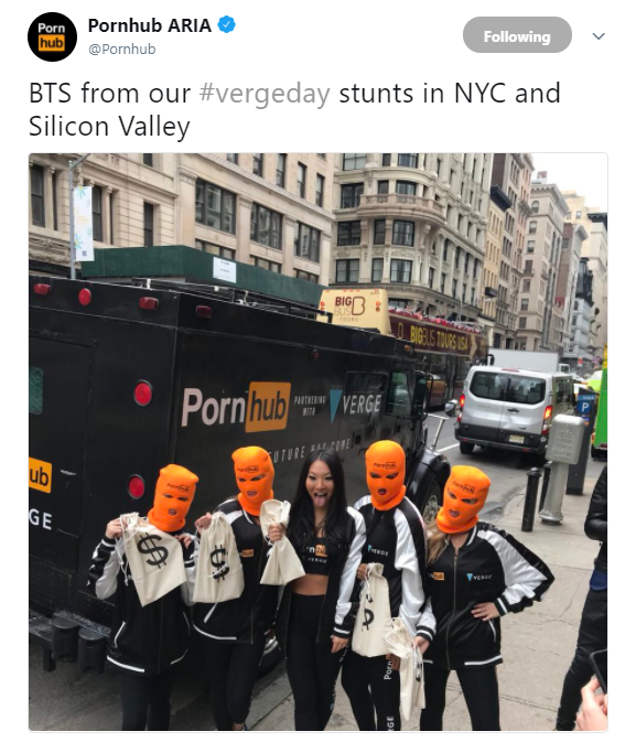 На протяжении последних суток все криптовалютное сообщество ждало анонса со стороны команды Verge по поводу своего таинственного партнерства, “крупнейшей коллаборации во всей индустрии”. Итак, таинственным партнером Verge оказался один из крупнейших в мире порносайтов – PornHub. Последние недели партнерство держалось в строжайшем секрете, а представители крипто-комьюнити строили свои догадки. Рынок ожидал объявления о техническом, банковском партнерстве, финансовой коллаборации с компанией, вроде JP Morgan, PayPal, TokenPay. Однако итоговая новость стала настоящим шоком. Несколько часов назад на улицах Нью-Йорка и Силиконовой Долины стали появляться плакаты, а также другие “фокусы”, прозрачно намекающие на партнерство Verge и PornHub: Также в Twitter PornHub появилась запись, обещающая награду в виде 300 000 XVG в честь празднования “Дня Verge”. Сообщество пользователей отреагировало на анонс положительно, большинство пользователей заявило, что ожидание “стоило того”, да