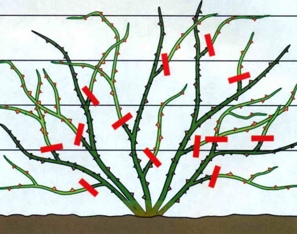 Плетущиеся розы, как и другие сорта роз, необходимо весной обрезать. Сложно заключается в том, что ветки переплетаются друг с другом, и очень сложно с ними работать. Сильную обрезку данного сорта делать не нужно, необходимо формировать куст, чтобы он вырос красивым. Поскольку лишние побеги могут сильно разрастись и забрать часть питательных элементов, это в результате скажется на цветении. Розы могут измельчать и плохо цвести. Плетущиеся розы необходимо начинать обрезать с крайних веток и углубляться внутрь куста. Основные ветки обрезаем до первой почки. Очень длинные ветки можно сделать по короче, чтобы куст выглядел пышнее. Все боковые, тонкие ветки срезаем. Также обрезаем ветки, которые растут внутрь куста. Их необходимо удалять, чтобы куст не загущался и хорошо проветривался. Тогда все ветки будут получать достаточно света и кислорода. Процедуру по обрезке веток роз проводим только продезинфицированным секатором, чтобы не заразить здоровые растения. После того, как куст