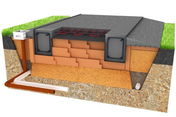 Утепленная шведская плита (УШП) Новейшие тенденции энергосбережения домов привели к появлению такого типа фундамента как утепленная шведская плита, суть которого сводится к тому, что : мелкозаглубленная монолитная плита, облачена в корыто из экструдированого пенополистирола, на песчаном основании. Внутри плиты замоноличены основные коммуникации, которые прокладываются в песчаной подушке и проходят через тело плиты, также в плите могут располагаться трубы теплого пола и электропроводка. Поверхность утепленной плиты имеет неодинаковую толщину. В зоне несущих стен она больше (20-30 см). Это необходимо для увеличения жесткости. В остальных местах слой армированного бетона не превышает 10-15 см. Точные размеры плиты в каждом конкретном случае определяет специальный расчет, выполняемый проектной организацией. Бетон в шведской плите со всех сторон окружает химически инертный пенополистирол, защищающий его от агрессивных грунтовых вод. Мощное утепление несущего основания уберегает д