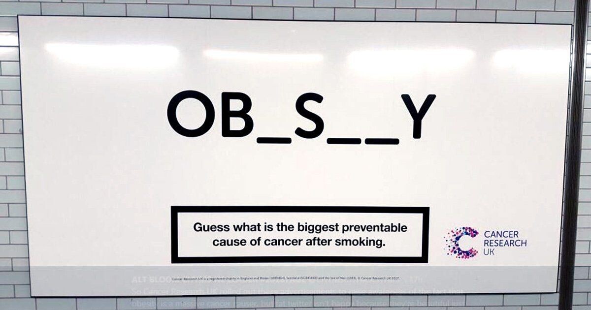 И вот, чтобы предупредить о надвигающейся катастрофе, Cancer Research UK, основной спонсор всех онкологический исследований в Великобритании, размещает просветительские билборды в английских городах. Как например этот: