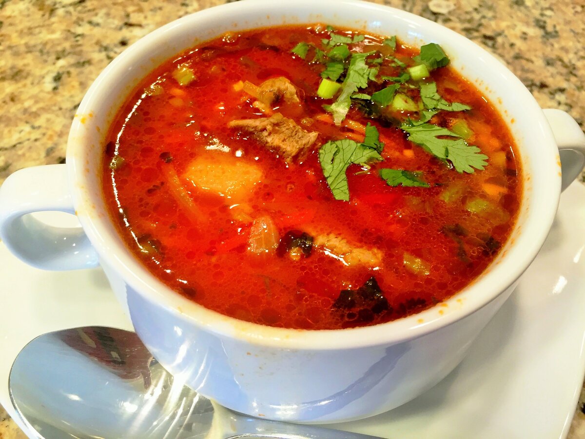 На 4 порции Время приготовления: 2 часа 2 небольшие луковицы 1 крупная морковь 300 г свежей белокочанной капусты 3 средние картофелины 4 ст. л. растительного масла 3–4 крупных солёных огурца 2 л мясного бульона 1–2 лавровых листа 4 ст. л. сметаны для подачи зелень укропа и петрушки для подачи соль по вкусу