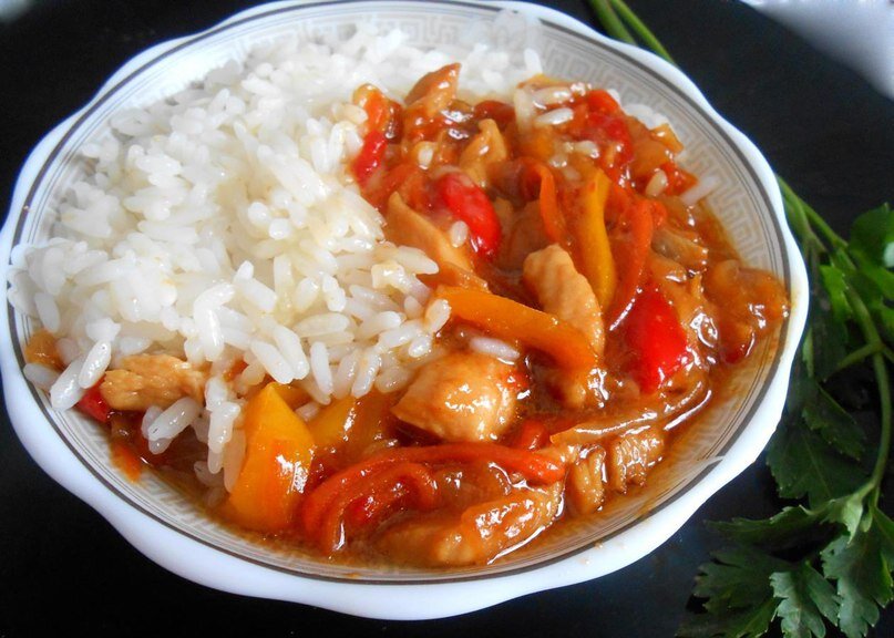 3. Обжарить курицу, соединить с соусом и потушить еще минут 10. Подавать с рисом. Приятного аппетита!