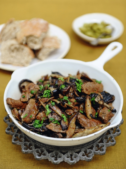 Ингредиенты: 1 красный лук 1 зубчик чеснока 1 лимон маринованные грибы 2-3 веточки свежей петрушки 500 г. филе говядины 1 чайная ложка паприки оливковое масло 50 мл сметаны Готовим: Очистите и нарежьте полукольцами лук и чеснок, затем мелко натереть лимонную цедру. Очистите грибы и мелко нарезать петрушку. Стейки отбиваем и нарезаем тоненькой соломкой. В большой сковороде на среднем огне обжарьте грибы , обжарьте до тех пор, пока грибы не станут золотисто-коричневыми, а затем выложите на тарелку. Добавьте немного масла и обжарьте говядину в течение 5-6 минут, помешивая, пока не станет коричневой, (до исчезновения влаги). Смешайте паприку, лимонную цедру и черный перец вместе, добавить лук, грибы, посолите по вкусу перемешать ,добавить сметану и уменьшаем огонь до минимума. Накрываем крышкой и оставляем на 8-10 минут. Затем добавляем нарезанную петрушку перемешиваем и выключаем. ПРИЯТНОГО АППЕТИТА!