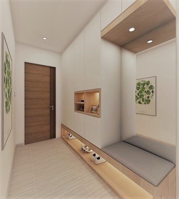 Пожалуй лучшее дизайнерское решение в сфере мебели для прихожих/коридоров. Если коридор узкий, то пространство в нём необходимо использовать на 100%. Так и поступили дизайнеры данной квартиры создав вместительный шкаф 3 в 1. Особого внимания достойно место для хранения обуви во всю длину коридора. Сам шкаф плавно перетекает в пуф с мягким сиденьем и широким зеркалом с подсветкой. Дизайнеры также не забыли про нишу с полкой для мелких вещей при входе. В завершение интерьера, на противоположной стене, повесили контрастную картину ярко зеленого цвета, чтобы стена не казалось пустой. Перед началом ремонта, обязательно продумайте все места, где у Вас будет подсветка, чтобы электрики заранее сделали всю необходимую проводку. Читайте также: 5 способов расширить жилую площадь Используем место в ванной эффективно Спальня - сердце квартиры