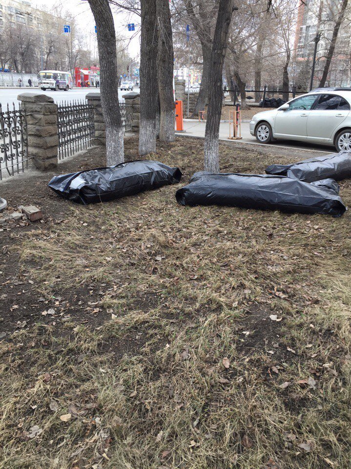 Такую жутковатую картину могли сегодня наблюдать жители Челябинска. Как выяснилось в мешках находились совсем не трупы, а прошлогодняя листва. Сотрудники Челябинской городской больницы не нашли более подходящих пакетов для уборки мусора. У медиков Челябинска своеобразный юмор. Руководство больницы отказалось комментировать эту ситуацию.