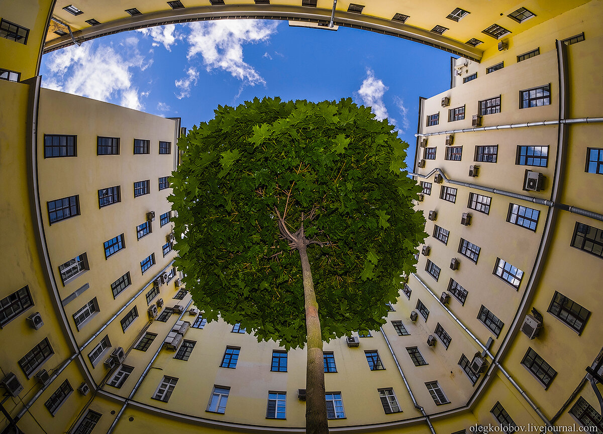 Мне непонятно, как может расти это дерево, даже летом почти не видя солнца. Яркий солнечный день и если бы не лампочка над входом в парадную, на дне этого колодца было бы почти ничего не видно. Цветная фотография обычного питерского дня в начале декабря. Ещё одна фотография декабрьского питерского неба и двора сложной геометрической формы. Иногда дворы-колодцы похожи на заброшенные секретные объекты. Стена улыбака. Дворы треугольники. Несколько домов образовали этот двор. С фонарём дворик стал значительно уютнее. Этим дворам тоже не помешали бы фонари. Предыдущие "Головокружения" можно посмотреть здесь: Головокружение - 1 Головокружение -2 Головокружение - 3 Головокружение - 4