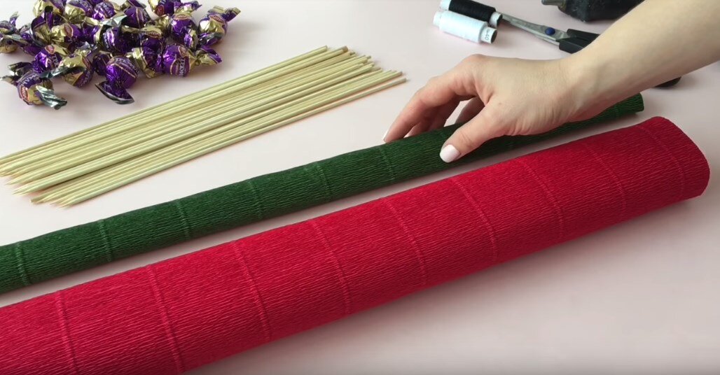 Сегодня вы узнаете, как очень просто сделать розы из гофрированной бумаги. Получается очень шикарный букетик! На это у вас уйдет всего 5 минут. 1. Все, что нам понадобится 2. Вырезаем 2 одинаковых квадрата 3. Из прямоугольника мы будем делать чашелистики 4. Из полоски получится ножка 5. Для одной розы нам потребуется 2 лепестка. Закругляем их по краям 6. Вырезаем чашелистик вот таким образом 7. Растягиваем его немного и закручиваем 8. Складываем внахлест 2 красных лепестка и немного растягиваем 9. Заворачиваем внутрь круглую конфетку 10. Наносим клей с помощью пистолета и приклеиваем палочку к бутончику. Обматываем самый низ бутончика ниткой 11. С помощью термоклея приклеиваем чашелистики 12. Приклеиваем и закручиваем зеленую полоску на ножку розочки 13. Закручиваем немножко лепестки розы, закручивая тем самым наш бутон Готово Таким же образом делаем остальные розы для букета Перематываем скотчем наш букетик и упаковываем в бумагу Дорогие наши подписчики и читатели, п
