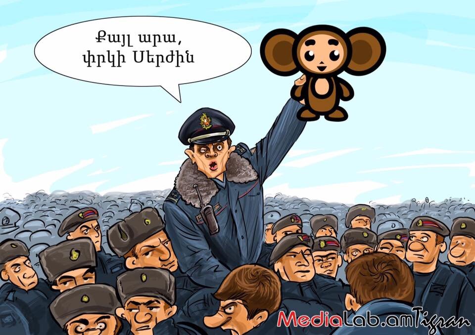 Самая популярная на данный момент группа армянских карикатуристов - MEDIALAB. Авторы успевают создавать рисунки на самые злободневные темы. Посмотрим на события последних дней их глазами. "Сделай шаг, спаси Сержа". Пародия на слоган митингующих, который в переводе звучит как "Сделай шаг, откажи Сержу". На карикатуре изображена группа полицейских, один из которых держит в руках Чебурашку, призывая спасти новоизбранного Саркисяна. "Народ говорит "Да"! Человек с логотипом Первого Национального Телеканала Армении держит кукол, кричащих "да". "Армения не развивается экономически из-за митингов". Серж Саркисян резюмирует ситуацию. "Невинный горожанин пострадал от митингующих", - говорит ведущая. Карикатура иллюстрирует освещение государственными телеканалами вирусного видео, на котором группа молодых ребят не дает проехать мужчине на иномарке, который безуспешно пытается вызвать их на конфликт.