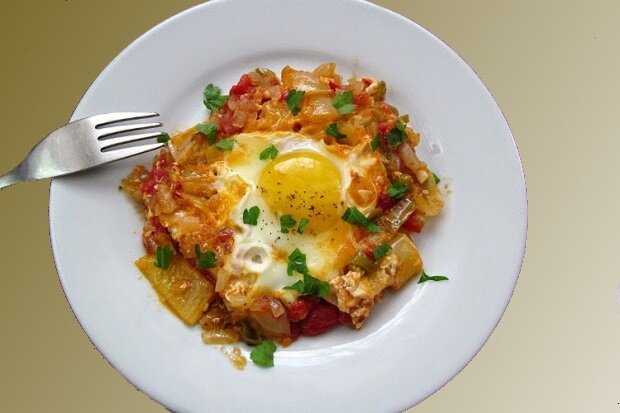 Это блюдо называется "Шакшука". В Израиле её часто готовят на завтрак и называют еврейской яичницей. Однако, бытует мнение, что родина "Шакшуки" - Тунис, а евреи просто популяризировали её. Впрочем, как бы то ни было, яичница эта очень вкусна, сытна и вполне себе кошерна)). Ингредиенты: 2 куриных яйца, 3 помидора, 1 болгарский перец, 1 луковица, 2 зубчика чеснока, 2 ст.л. растительного масла, 0,5 ч.л. зиры,зелень, соль, красный и черный молотый перец по вкусу. Приготовление: Очищаем, мелко нарезаем луковицу и обжариваем на разогретой с растительным маслом сковороде. Пока лук подрумянивается, нарезаем небольшими кубиками болгарский перец и добавляем в сковороду. Продолжаем обжаривать овощи ещё минуты 3. Очищенные от кожицы помидоры так же режем кубиками и отправляем к луку и перцу. В это время солим, перчим наше блюдо и добавляем зиру. Убавляем огонь до минимума и тушим минут 7. Добавляем мелко нарезанный или пропущенный через чеснокодавилку чеснок и тушим еще пару минут. Теперь ложкой