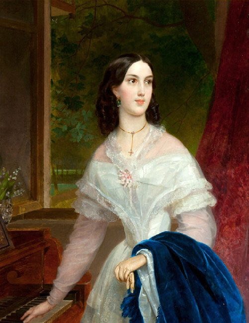 Брюллов — отличный и известный портретист, про его выставку я рассказывала в одной из прошлых статей. Портрет нежной красавицы-брюнетки «Дамы у фортепьяно» (1838г.) никак не вызывал ассоциации со страстями, драмами и уж тем более пороком. Работа эта хранится в частной коллекции, но ее репродукции вполне узнаваемы — присутствуют практически во каждом каталоге произведений Брюллова. Интересный факт: красавица на картине – Эмилия Тимм, жена Карла Брюллова, в которую художник влюбился с первого взгляда, а браке прожил 2 месяца. Почему? Сейчас расскажу. Брюллов был заядлым холостяком, а по меркам старой России заядлейшим. Подруги, любовницы, пассии, но ничего серьёзного. И вот, когда художнику было под сорок, произошло чудо: Брюллов встретил ту самую. Ею оказалась дочь чиновника из Риги Эмилия Тимм. Девушке на тот момент было всего 17! Семья была состоятельная, ее рады были видеть на балах столицы. Эмилия была не просто очаровательна, но и имела таланты. С 16 лет музицировала и преподавал