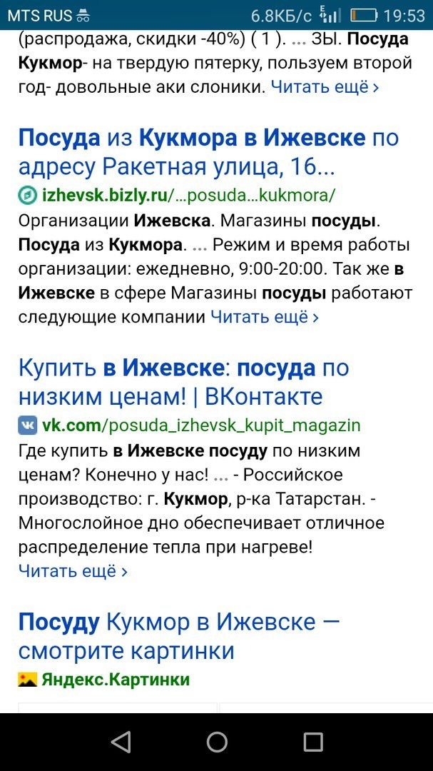 Раньше в моём магазине самым маржинальным товаром были мясорубки Аксион. Но после смены власти на сбыте завода - они стали продавать мясорубски сами и дешевле чем они стоят для меня на закупе, а значит маржа будет отрицательной. Окей, меняем ориентацию... В смысле приоритетный товар. Аксион у нас в Ижевске но недалеко есть оху.. великолепный в смысле завод "Kukmara" в Кукморе, производящий крутую посуду. Будем продавать посуду и хорошо зарабатывать. В магазинах посуду берут как обычно, вяло, значит - надо идти в интернет. Встречайте, мой "пятачок в Интернете" - оптимизированная для поиска крутой посуды в Ижевске группа: Купить в Ижевске: посуда по низким ценам! Вчера знаменательная дата - группа вышла в топ и показывается на втором месте сразу после специализированного магазина Кукмара на задворках города: