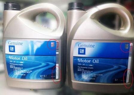Стоит отметить, что в плане информативности, оригинальная этикетка GM практически не отличается от подделки. Тем не менее, на поддельном масле используются более темные краски и видны размытые буквы. Поскольку изготовитель контрафакта экономит на качестве печати, установив обе канистры рядом, невооруженным глазом можно отличить смазочные материалы. Поскольку отличается шрифт и на задней стороне информация имеет более тусклый оттенок.