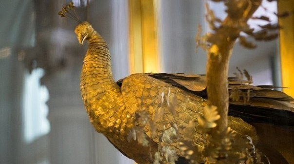 В 1777 году князь Григорий Потемкин решил в очередной раз удивить императрицу Екатерину. Его выбор пал на работу английского механика Джеймса Кокса. Почему именно на него, неизвестно. Возможно, русский граф увидел удивительные вещи в рекламных каталогах, которые издавал мастер. Чтобы отправить подарок в Россию, его пришлось разобрать. Разобрать-то разобрали, а вот собрать не смогли – часть деталей оказалось то ли сломана, то ли утрачена. Так и пылился бы эффектный подарок, если бы в 1791 году Потемкин не поручил «оживить птичек» Ивану Кулибину. И мастер высочайшего класса сделал невозможное: часы пошли, а затейливый механизм пришел в движение. Как только часы начинают звонить, «оживает» сова в клетке.