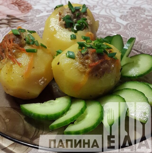 Фаршированный картофель в духовке Предлагаю приготовить блюдо, которое станет прекрасным выбором, как для праздничного стола, так и для обычного ужина с семьей. Им Вы сможете порадовать не только своих родных, но и гостей. Простой в приготовлении рецепт фаршированного картофеля достаточно бюджетен, но вместе с тем превращает обыкновенный картофель в оригинальное и аппетитное блюдо. Ингредиенты: Рецепт приготовления фаршированного картофеля: 1. Для начала выбираем картофель одинакового размера и формы. Картофель необходимо вымыть и очистить. 2. Далее вынимаем из клубней серединку. Для этого можно использовать чайную ложку или специальную ложечку для вырезания шариков из овощей и фруктов. Стараемся сделать углубления побольше, чтоб поместить достаточное количество фарша. 3. Приступим к подготовке фарша. Нарезаем луковицу кубиками и добавляем в фарш. Солим и перчим по вкусу. Фарш необходимо слегка отбить, чтобы из него вышел лишний воздух и он хорошо держал форму. 4. На сковороде обжа