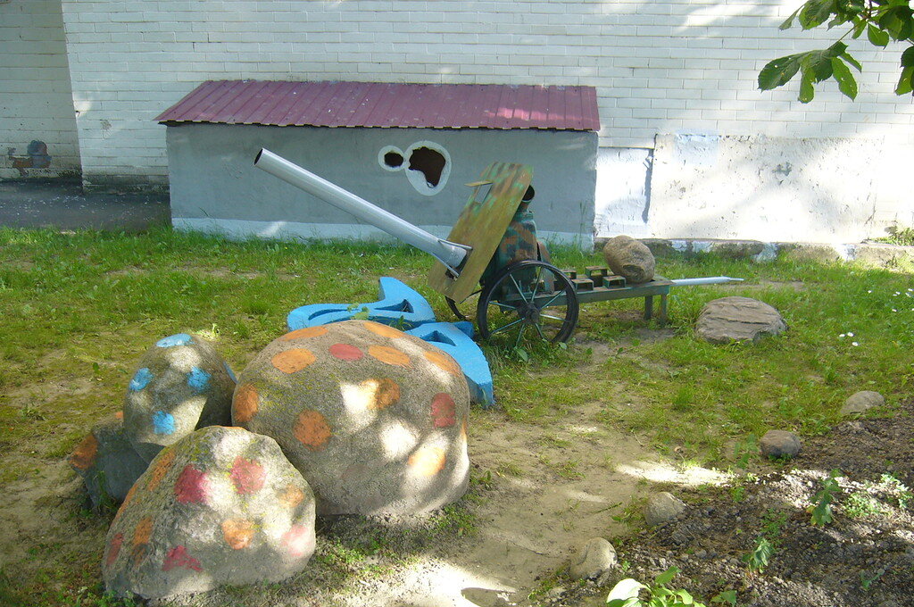 Люди с необычной фантазией живут в этом дворе. Никогда и нигде не видела я таких дворовых украшений. Все больше аисты. Наверное, бывший военный командует парадом на прилегающей к дому территории.