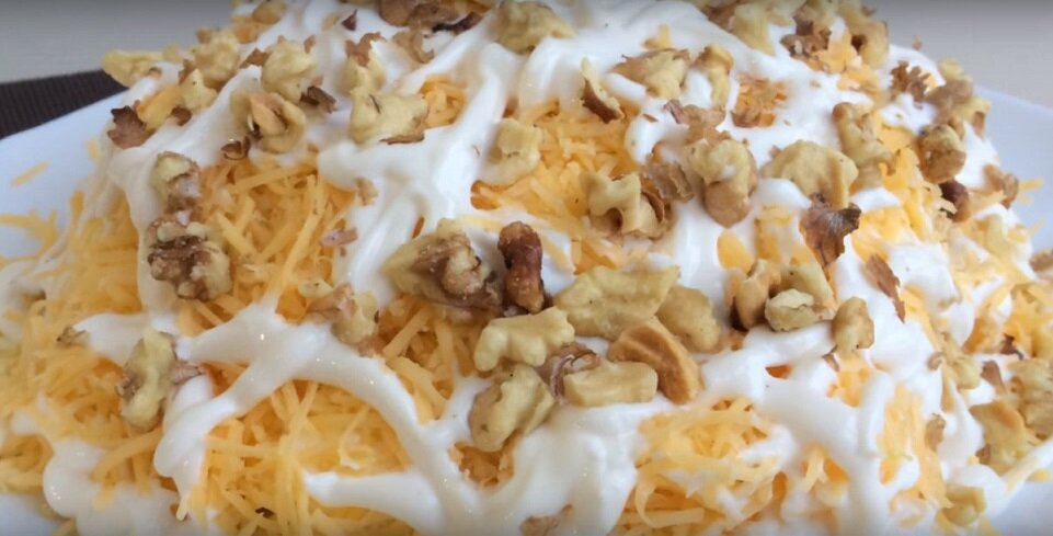 Этот салат, который мы с вами приготовим, подойдёт как для праздничного стола, так и на обед или ужин, готовится он очень быстро и просто, а получается вкуснятина! Приступаем! Для приготовления нам понадобится · 200 грамм мяса креветки · 150-200 грамм твёрдого сыра · 4 яйца · 2 яблока · 30 грамм грецких орехов · 200 грамм майонеза · Сок лимона На мелкую тёрку натираем сыр и складываем в тарелку. Очищаем варёные в крутую яйца и также на мелкую тёрку натираем их, перекладываем в другую тарелку. Яблочки промываем, очищаем от кожуры и натираем на крупной тёрке в миску, сверху сбрызгиваем лимонным соком, он придаст пикантный вкус и не даст яблокам потемнеть. Берём плоскую тарелку и первым слоем выкладываем мясо креветки, также для этого салата можно использовать крабовые палочки, крабовое мясо, мясо криля, салат будет один, а вкусы получатся разные, экспериментируйте! Только мясо, которое вы будете использовать, предварительно нарежьте мелкими кусочками. Берём майонез в пакете (также можн