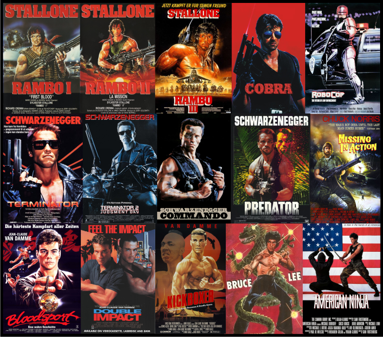 Нетрудно догадаться, каким кинофастфудом насыщались мы с друзьями. А было нам тогда лет по 10-12. Шварценеггер, Сталлоне, Ван Дамм, Джэки Чан, Брюс Ли, Чак Норрис… Плакаты именно с их изображениями украшали стены наших комнат, а значки красовались на куртках. Футболки же можно было сделать самостоятельно, благодаря картинкам-наклейкам, наносимым на ткань с помощью утюга.