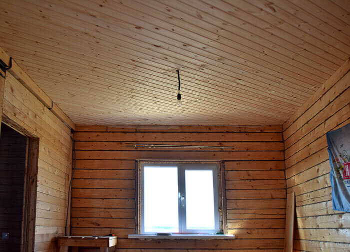 Экономим материал и получаем красивый результат. Вагонку на потолке не обязательно прибивать под прямым углом. Можно и по диагонали.