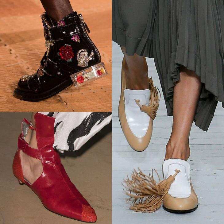 Креативные ботинки Любительницы стиля милитари и мужского стиля не обделены вниманием в этом сезоне. Среди основных тенденций можно отметить грубые лоферы, мокасины, высокие ботинки со шнуровкой. Для оформления часто используется искусственная кожа змеи и различные принты, имитирующие шкуру животных. Грубые ботинки с высоким голенищем сочетают с легкими платьями и женственными нарядами. Стильно смотрятся ботинки на тракторной подошве в сочетании с зауженными джинсами и брюками. Лоферы и другие ботинки на низком каблуке носят с длинными юбками и платьями. Это не только стильно, но и удобно при повседневном ношении. Обилие ремешков и шнуровок, характерное для обуви этого сезона, коснулось и ботинок. Часто используется затейливая шнуровка наряду с контрастным цветом шнурков по отношению к обуви. Немало моделей представляет собой нечто среднее между ботинками и классическими полусапожками. Они имеют элегантный женственный фасон, высокую шнуровку, какая в моде уже давно, и грубую подошву в
