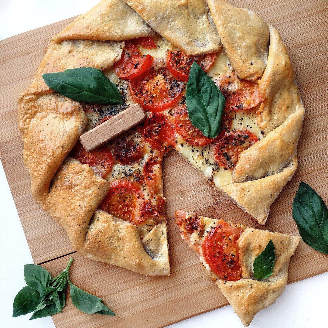 Супер рецепт , на приготовление которого уходит всего 15 минут) Любите не сладкую выпечку?) я просто обожаю) Галета получается не только вкусным вариантом обеда или перекуса, но и красивым украшение стола) Ингредиенты: •270г муки (цельнозерновая+рисовая 1:1, можно использовать обычную пшеничную) •1 яйцо •60 мл оливкового масла •60 мл воды •соль Для начинки: •3-4 крепких средних помидора •400 г сыра (лучше моцарелла) •1 ч.л. сушеного базилика •соль, черный перец Приготовление: Просейте муку с солью в большую миску. В другой миске смешайте тёплую воду, оливковое масло и яйцо, передайте в миску с мукой. Замесите мягкое эластичное тесто, скатайте его в шар и положите в миску. Накройте пищевой плёнкой и оставьте на 1 час. Разогрейте духовку на 180 гр. Раскатайте тесто в круг (примерно 36см). Застелите противень фольгой, смажьте каплей масла и выложите тесто. Нарежьте помидоры кружками толщиной 5-7мм, положите в миску, немного посолите и поперчите, посыпьте базиликом. Сыр нарежь