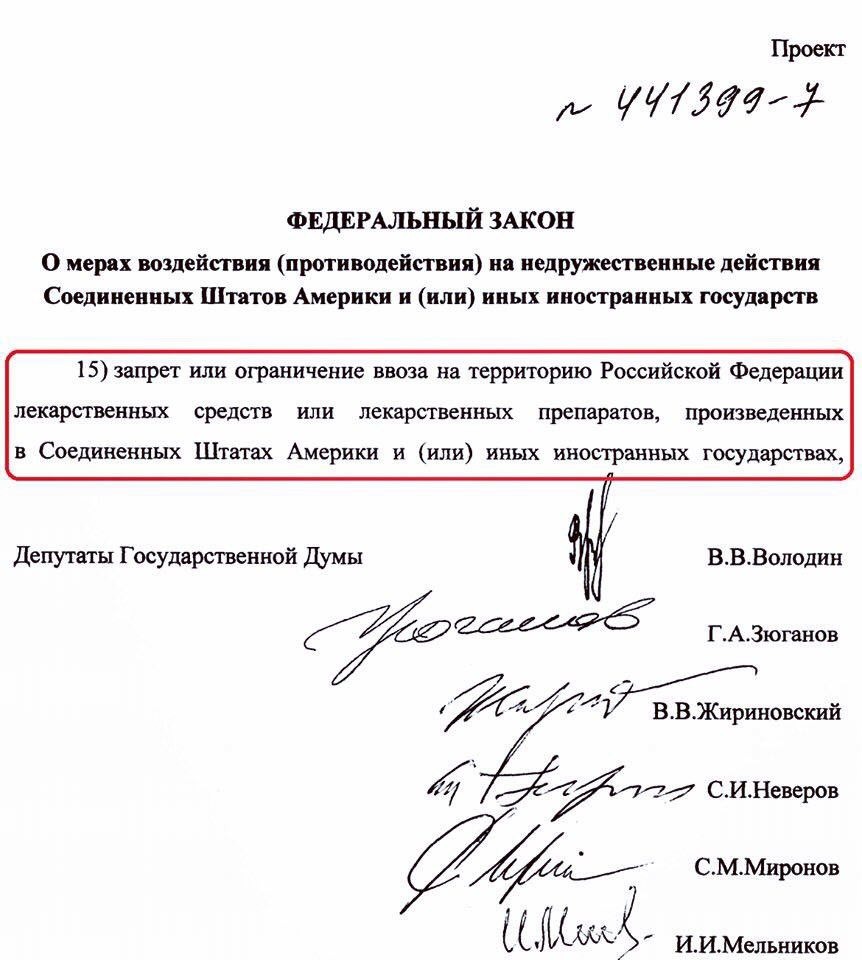 В Государственной Думе РФ в работе законопроект о мерах противодействия на недружественные действия Соединенных Штатов Америки или иных иностранных государств в отношении России. Проект закона прошел согласование ключевых фигур в Государственной Думе: председателя и лидеров фракций (В.Володин, Г.Зюганов, В.Жириновский, С.Неверов, С.Миронов, И.Мельников). Это мы им так отомстили за то, что российских дипломатов выслали из Штатов и включили в санкционные списки крупнейших бизнесменов и подконтрольные им компании. Это совсем не смешно, железный занавес все сильнее и сильнее опускается, Россия берет вечный антракт. Вопрос: как это перенесут люди, чьи жизни находятся на постоянной поддержке лекарственных средств? Не секрет, что возможности российской фармакологии не вызывают восторга. И эта характеристика скорее аванс выданный данной отрасли, нежели описание реального положения. Более близко к теме высказался депутат ГД Толстой, предложивший настойку коры дуба в качестве отечественной аль